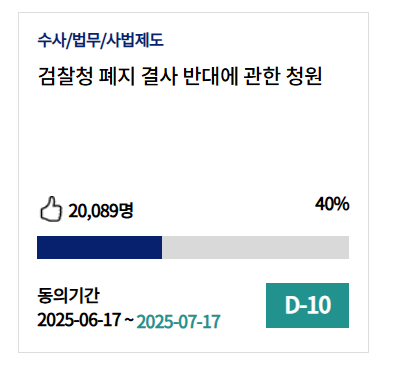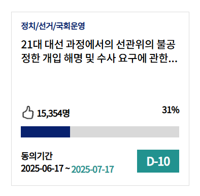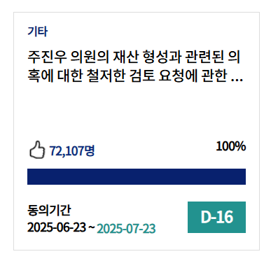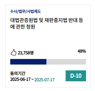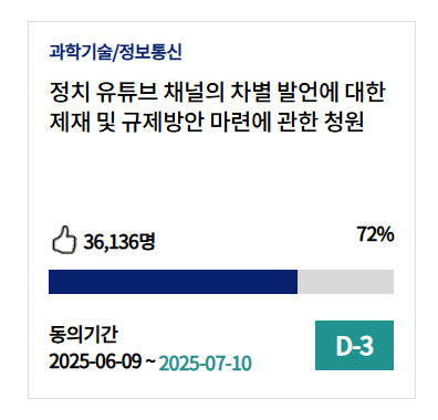 - 청원 회부 기준: 30일 이내 50,000명 동의 시 자동 회부