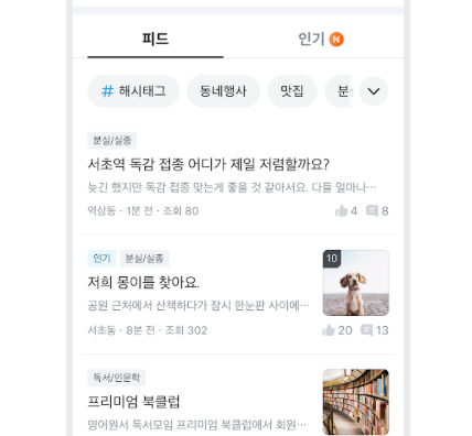 지역 기반의 실제 사용자 글들이 올라오는 공간이며