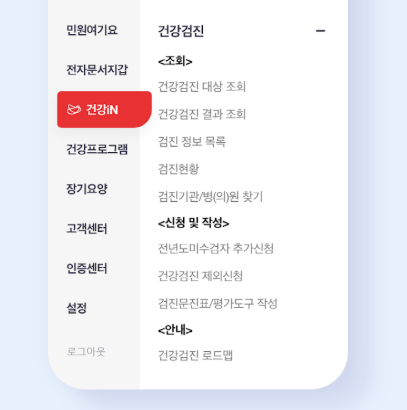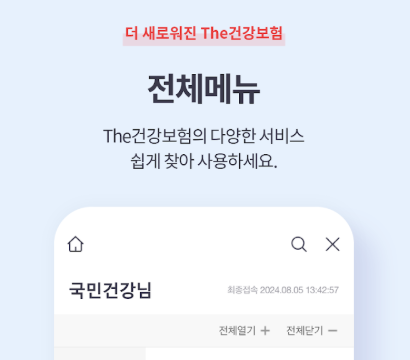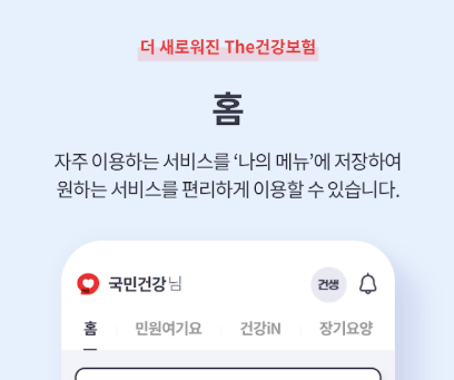 The건강보험 서비스는 공단 홈페이지내의 주요 콘텐츠를 국민들이 모바일에서 쉽고 빠르게 많은 정보를 접할 수 있도록 구성하였습니다.